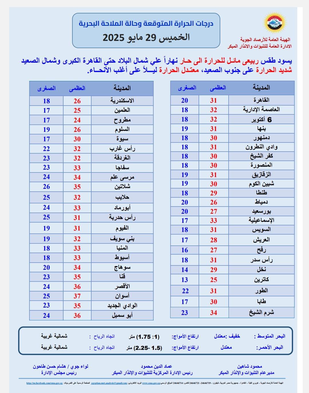 اليكم الان بيان هيئة الأرصاد الجوية بشأن درجات الحرارة المتوقعة غدا على اغلب الانحاء..