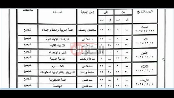 أعلنت مديرية التربية والتعليم عن جدول امتحانات الصف الثالث الإعدادي الترم الثاني 2025، والذي جاء كالتالي..