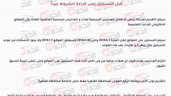 و يمكن لأولياء الأمور تقديم رياض الاطفال والصف الأول الابتدائي بالمدارس الرسمية والرسمية لغات للعام الدراسي 2025 / 2026 إلكترونياً لأبنائهم بالمدارس الرسمية والرسمية لغات، ويأتى ذلك لتخفيف العبء عن أولياء الأمور، واستعداداً للعام الدراسى الجديد ( 2025 / 2026)، وذلك من خلال بوابة مركز المعلومات التابعة للوزارة، وأكدت الوزارة أن سن التقدم للصف الأول الابتدائي لا يقل عن 6 سنوات ولا يزيد عن 9 سنوات، بينما لا يقل سن التقدم لرياض الأطفال عن 4 سنوات.