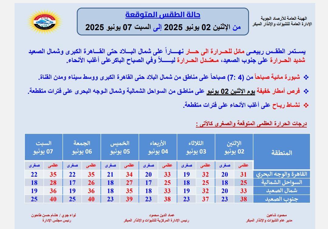 الأرصاد الجوية تعلن حالة الطقس اليوم الاثنين 2025/6/2 وبيان دراجات الحراراه بالمحافظات