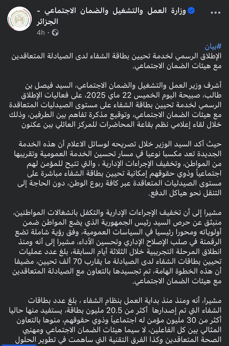 وسنوضح لكم بالخطوات طُرق تحيين بطاقة الشفاء في الجزائر، صرحت وزارة العمل لوجود الكثير من التعديلات الهامة والاساسية في خدمة تحيين بطاقة شفاء بالجزائر والتي لم يعتبر المؤمن عليه له اجتماعيا وذو حقوق ويكون بحاجة ان يتوجه إلي مراكز الدفع وهي التابع لصندوق التأمينات الاجتماعية ويمكن اجراء الخطوات مباشرة من خلال أكثر من 12,000 صيدلية منتشرة في جميع المحافظات، وتتوفر هذه الخدمة على مدار 24 ساعة يومياً، بما في ذلك أيام العطل والمناسبات الرسمية، مما يسهل على المواطنين إمكانية الحصول على أدويتهم بسرعة وسلاسة، خاصة في الحالات الطارئة والاستعجالية.