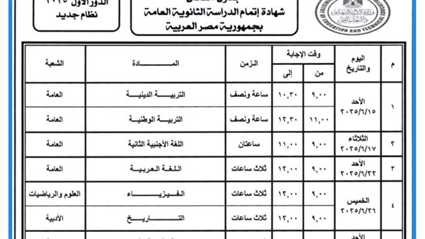 جدول امتحانات الثانوية العامة 2025 ادبي النظام الجديد