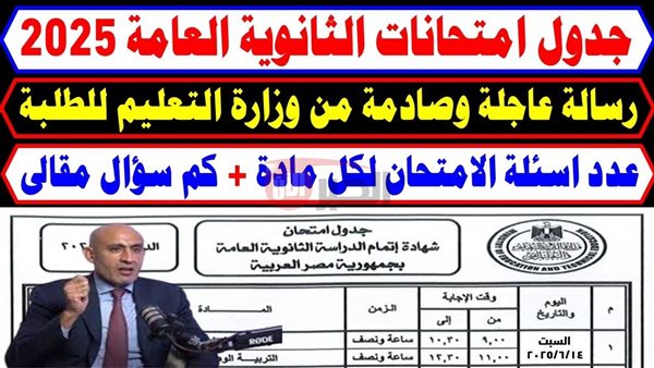 أعلنت وزارة التربية والتعليم رسميًا عن جدول امتحانات الثانوية العامة 2025 لكلا الشعبتين العلمية والأدبية، والتي ستنطلق بدءًا من يوم الأحد الموافق 15 يونيو 2025، وتستمر حتى يوم الخميس الموافق 10 يوليو 2025، وقد دعت الوزارة جميع الطلاب إلى الاستعداد الجيد لهذه الامتحانات الهامة، وبذل أقصى جهدهم لتحقيق أعلى النتائج والوصول إلى الأهداف التي يسعون إليها بكل طموح وإصرار، فدعونا الان خلال موقعنا الاخباري نعرض لكم جدول امتحانات الثانوية العامة.