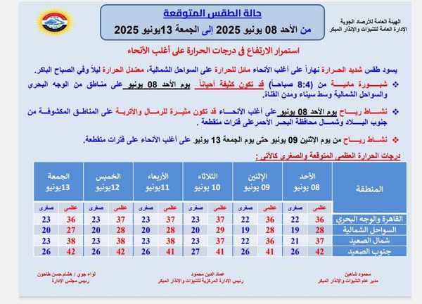الارصاد الجويه تعلن حالة الطقس اليوم الاحد 2025/6/8 وبيان درجات الحراراه بالمحافظات