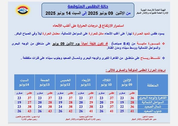 كشفت “الهيئة العامة للأرصاد الجوية” حاله الطقس اليوم الاثنين الموافق 9 يونيو 2025 والظواهر الجوية ودرجات الحرارة العظمى والصغرى المتوقعة اليوم،فقد نشهد استمرار الارتفاع في درجات الحرارة على أغلب الأنحاء حيث يسود طقس شديد الحرارة نهاراً على معظم الأنحاء، ومعتدل الحرارة ليلاً وفي الصباح الباكر، ومن خلال موقعنا الاخباري “ الخبر الآن” سنوضح لكم حاله الطقس اليوم استكمل معنا هذا المقال.