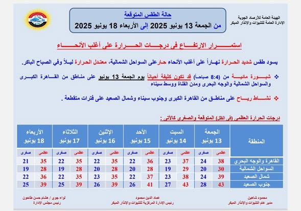 الارصاد الجويه تعلن حالة الطقس اليوم الجمعه 2025/6/13 وبيان درجات الحراره بالمحافظات
