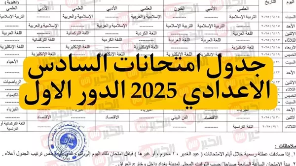 ووفقًا لإعلان وزارة التربية العراقية الصادر بشأن جدول امتحانات السادس اعدادي 2025 دور أول الشعبة الأدبية والعلمية، فقد جاء موعد بداية الامتحانات من يوم السبت الموافق 14 يونيو 2025، وذلك على مستوى جميع المحافظات العراقية، ومن المقرر أن تنتهي الامتحانات يوم الخميس الموافق 3 يوليو المقبل، أي ستستمر الاختبارات لمدة أسبوعين متتالين، وجاء الجدول كالآتي: