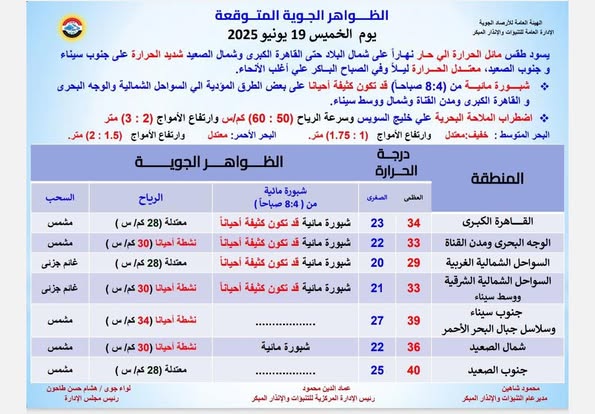 الارصاد الجويه تكشف حالة الطقس اليوم الخميس 2025/6/19 ودرجات الحراره بالمحافظات