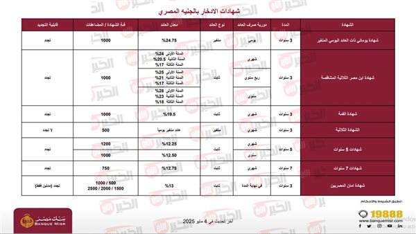 يهتم الكثير من المواطنين بـ أعلى عائد شهادات بنك مصر اليوم الادخار لعام 2025، تجمع بين الأمان والعائد المجزي، الأمر الذي يجعله وجهة مفضلة للمدخرين والمستثمرين، وجاء ذلك بعد قيام البنك المركزي المصري بخفض أسعار الفائدة الأساسية بنسبة 3.25% على مدار اجتماعين متتاليين هذا العام، الأمر الذي دفع بنك مصر إلى تعديل عوائد بعض الشهادات، والإبقاء على أخرى للحفاظ على جاذبيتها في السوق المصري، وتعتبر شهادة القمة الثلاثية من أبرز الشهادات المطروحة، حيث توفر عائد ثابت قدره 18.5% سنويا يصرف شهريا لمدة ثلاث سنوات، مع مرونة في الاسترداد بعد مرور ستة أشهر من تاريخ الشراء، وفي صدد حديثنا هذا نعرض لكم في السطور القادمة تفاصيل أعلى عائد شهادات بنك مصر اليوم.