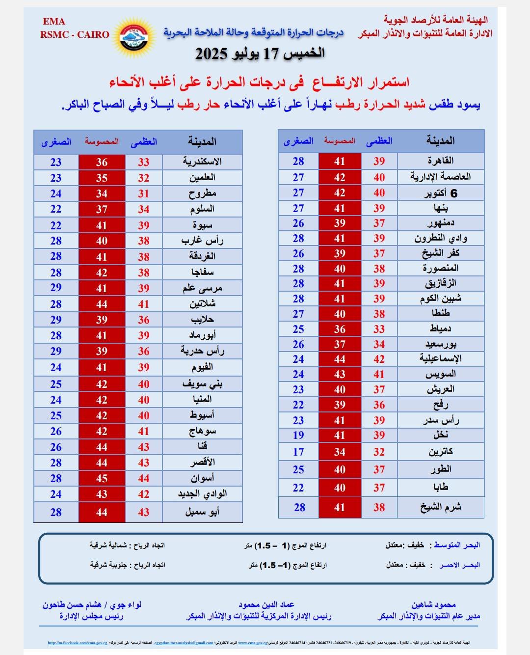 كما كشفت هيئه الأرصاد الجوية عن درجات الحرارة المتوقعة غدا الخميس 17 يوليو 2025 على اغلب الانحاء، والتي جاءت كالتالي..