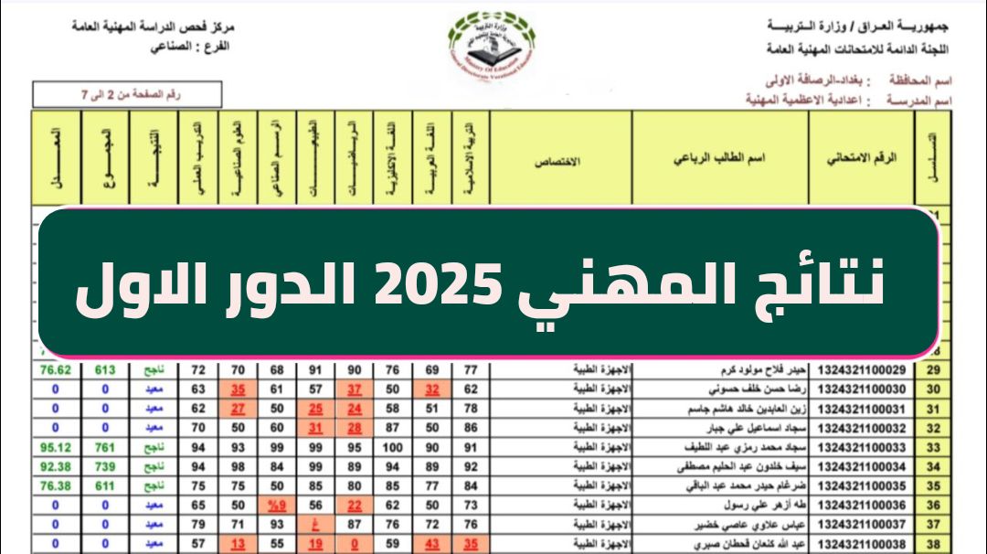 أعلنت وزارة التربية العراقية، اليوم الأحد، عن نتائج السادس المهني 2025 الدور الأول للعام الدراسي 2024–2025 ، وتشمل كل المديريات في المحافظات العراقية، وذلك بعدما انتهت الامتحانات الوزارية بشكل رسمي.