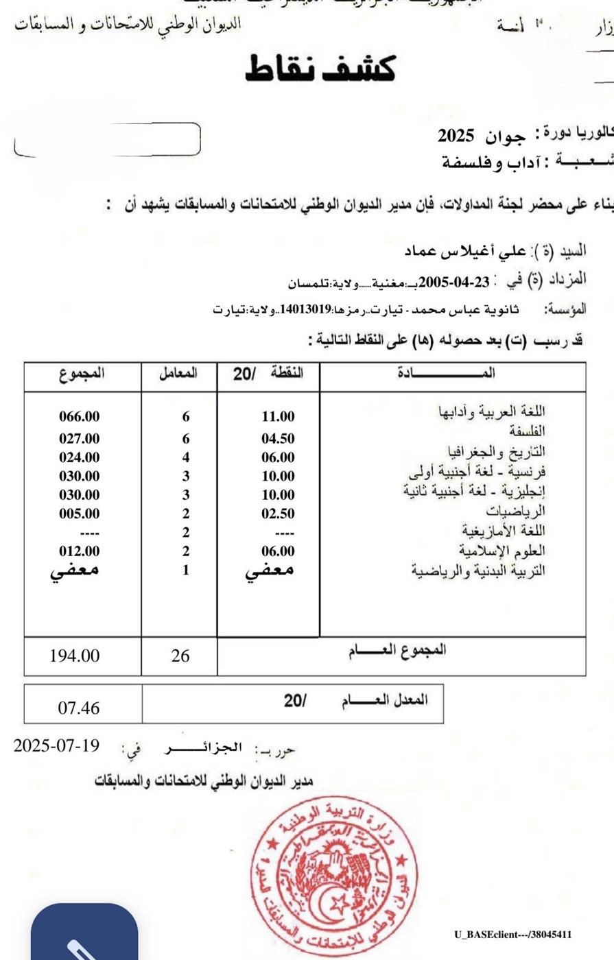 يحتوي كشف النقاط بكالوريا 2025 الذي يتم سحبه عبر موقع الديوان الوطني للامتحانات والمسابقات على البيانات التالية: