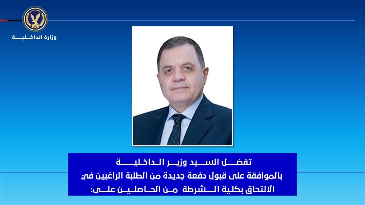 - كماجاء موعد التقديم لكليه الشرطه لخريجي ليسانس الحقوق من الذكور والإناث، وخريجات التربية الرياضية من دفعة عام 2024، والحاصلين على مؤهلات جامعية (بكالوريوس، ليسانس، ماجستير، دكتوراه) من تخصصات محددة مطلوبة في الوزارة، وكذلك خريجي كليات الطب البشري من دفعات العامين الماضيينن، من الثلاثاء 22 يوليو وحتى الخميس 14 أغسطس، ولمدة 26 يومًا.