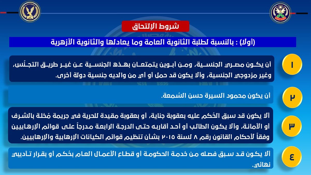 - أن يكون الحد الأدنى للقبول في أكاديمية الشرطة لطلاب الثانوية العامة والأزهرية وما يعادلها هو 65% من دفعة عام 2024.