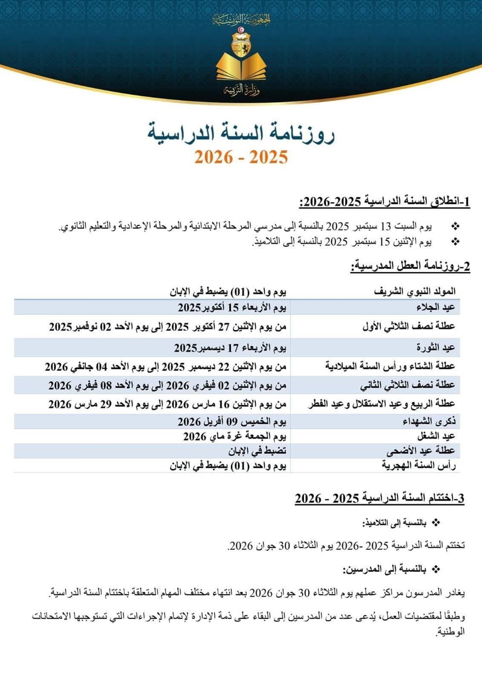 - تختتم السنة الدراسية 2025-2026 بالنسبة للتلاميذ يوم الثلاثاء 30 جوان 2026.