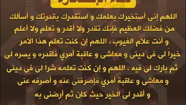 "اللهم إني أستخيرك بعلمك، وأستقدرك بقدرتك، وأسألك من فضلك العظيم، فإنك تَقدِرُ ولا أقدر، وتَعلمُ ولا أعلم، وأنتَ علاّمُ الغيوب.