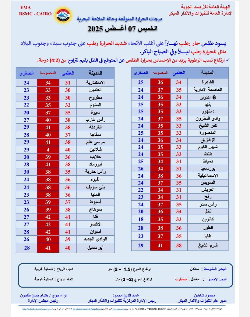 اعلنت الهيئة العامة للأرصاد الجوية ان حالة الطقس غدا الخميس 7 أغسطس 2023 ستشهد نشاط رياح على كافه الانحاء قد تكون مثيره الرمال والأتربة على بعض المناطق، بالإضافة الى ارتفاع في نسب الرطوبة يزيد من الإحساس بحرارة الطقس، وشبوره مائية على بعض الطرق المؤدية من والى مناطق من شمال البلاد حتى القاهرة الكبرى، ومن المتوقع ان تسجل درجة الحراره غدا في القاهرة والوجه البحري 35 العظمى 37 للمحسوسة في السواحل الشمالية 30 للعظمى و33 للمحسوسة، فدعونا الان خلال موقعنا الاخباري نعرض لكم تفاصيل حالة الطقس غدا.